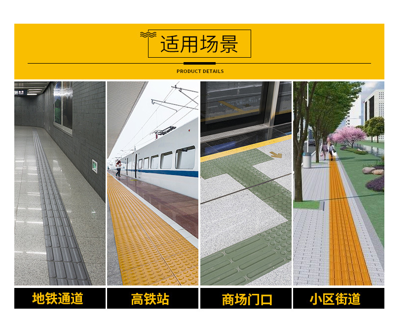 盲道磚用途:黃色盲道磚用于高鐵站、市政道路人行道、殘聯(lián)